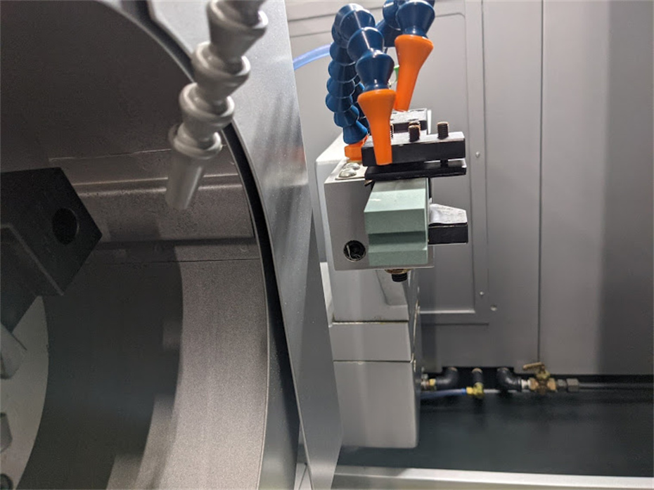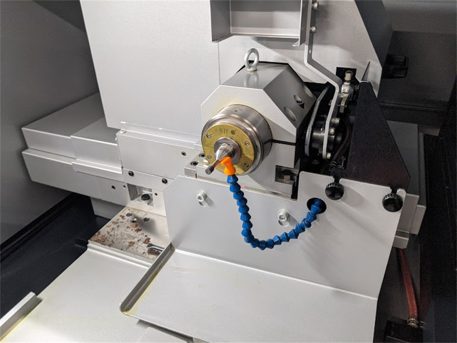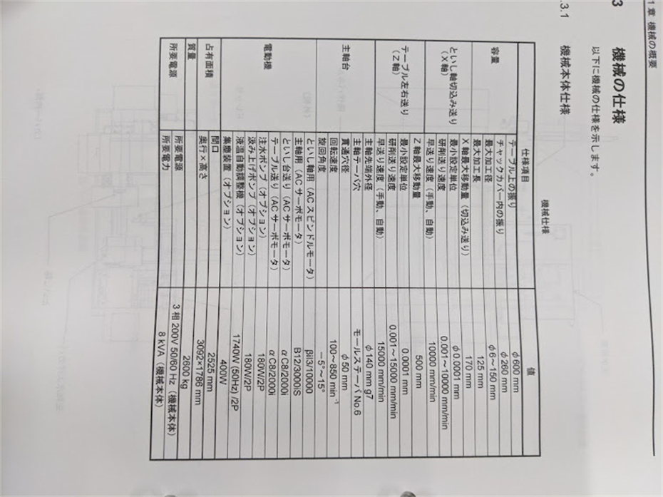 Fanuc系统,工作台上的摆动:φ600mm最大加工直径:φ150mm最大加工长度:125mm切削轴最大移位动量(X轴):170mm Z轴最大移动量:500mm主轴锥形:No.6主轴贯通孔径:φ50主轴旋转速度:850回转角度:-5°~15°卡盘,1h磨头75000转,2h磨头150000转。